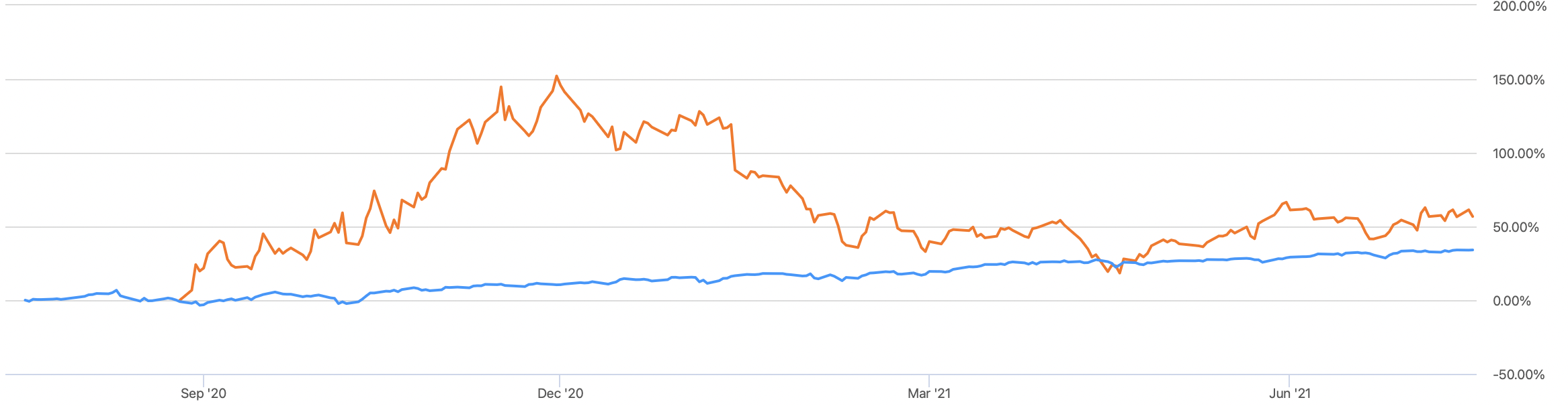 초반에 지수의 상승과 괴리감이 크게 오를 수 있었던 이유로는 주식이 락업되어 있어서 주식 수가 워낙 없다보니 조그마한 매수에도 이렇게 크게 상승했다. 시간이 지나면서 점점 풀려서 비이성적 상승이 이성을 찾았다고 생각이 든다.