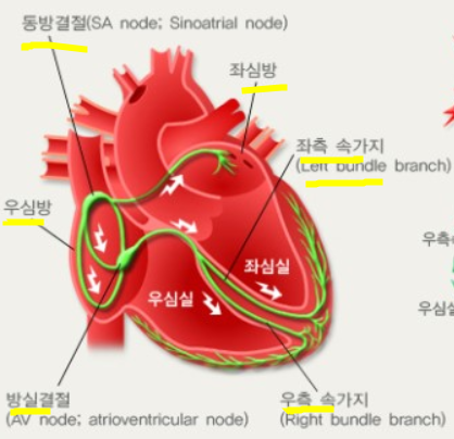 동(방)결절 (SA node): pacemaker -> 방실 결절 (AV node) -> 히스속 (bundle of HIS)-> 푸르키녜 섬유