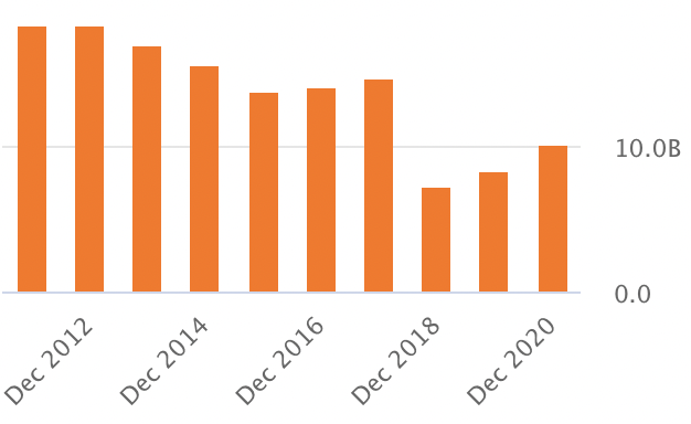 화이자의 영업이익은 꾸준히 감소해 왔다. 매출이 꾸준히 감소해 왔기에,, 당연히 영업이익도 감소해 왔다.