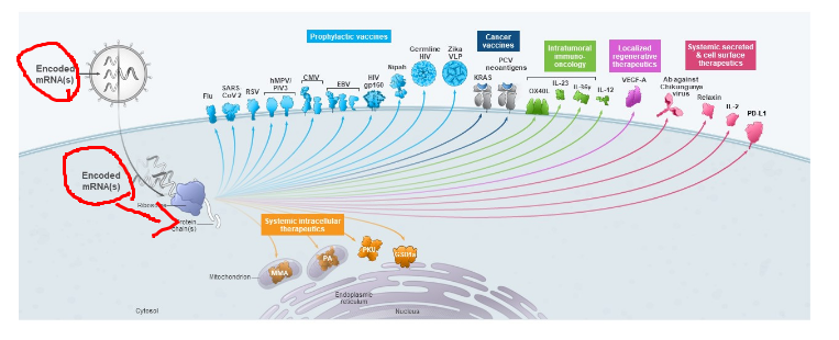 mRNA를 이용해서 원하는 단백질을 원하는 조직과 세포에 발현시켜 암이나 전염성 질병을 치료한다.